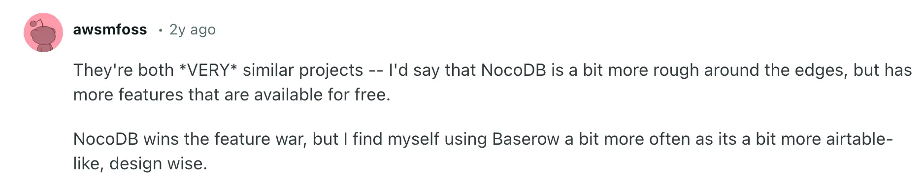 In discussions about self-hosting and internal tools, users often say NocoDB offers more flexibility for developers, while Baserow feels more polished and accessible for non-technical users.
