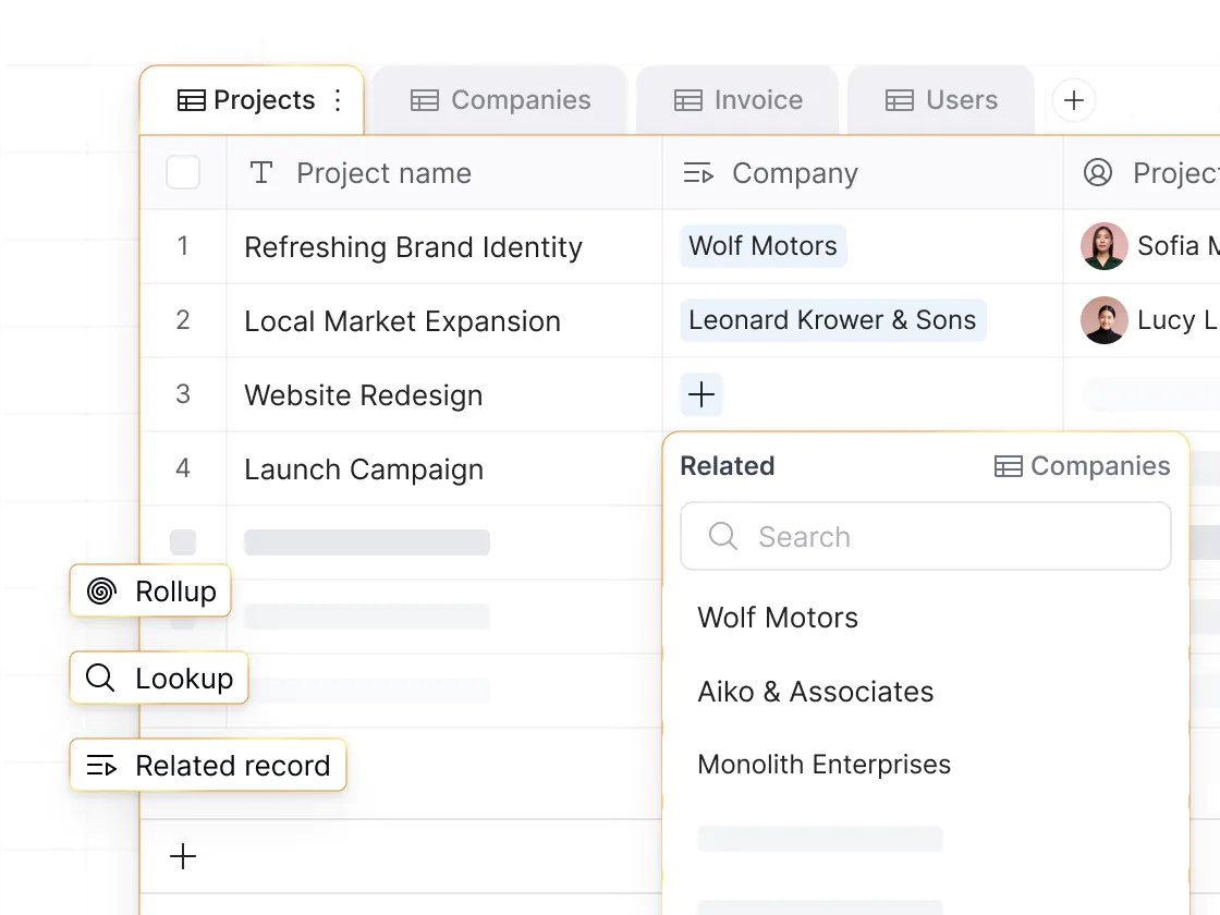 - Relational data modeling: Tables can be linked together through relationships. This allows teams to structure datasets — for example connecting projects, clients, and tasks — while still working visually.