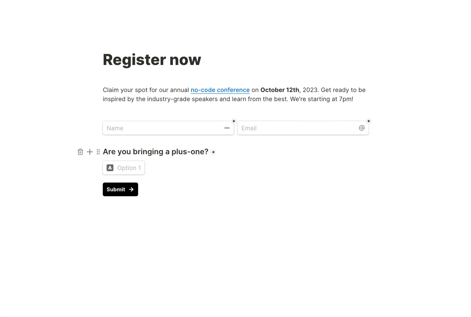 - Notion-style interface: Build forms by typing, adding blocks, and using slash commands (/), just like on Notion.