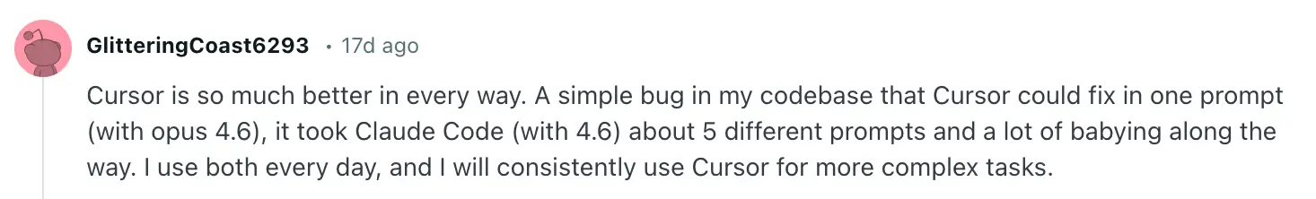 One user found that Cursor fixed a bug in a single prompt that took Claude Code five prompts and a lot of hand-holding. It is worth noting, though, that this comment was posted just before Code Review was launched, so that comparison might already be dated.
