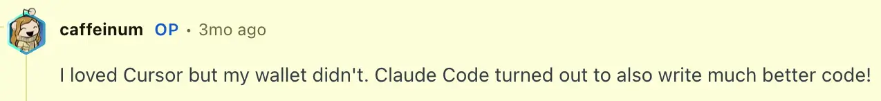 Claude Code has its defenders too. One user said they'd pay for it even if someone gave them Cursor for free, citing Cursor's murky pricing and unclear product direction. Another switched after realizing Claude Code was just…better at coding.