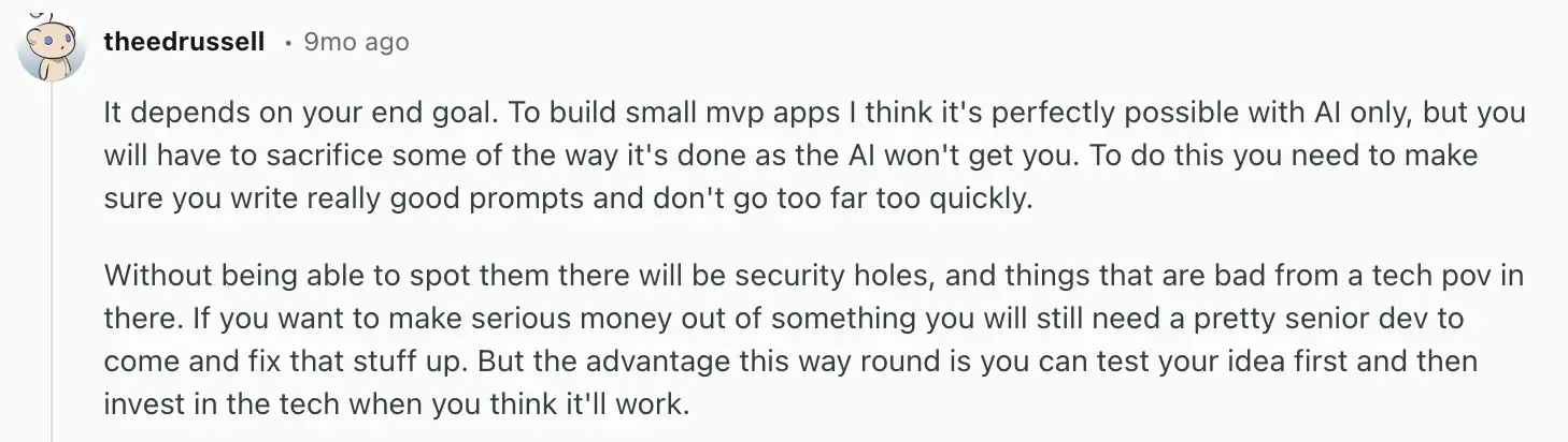 Most of the comments above came from developers. In another thread, a Redditor with no coding experience asked whether it was a good idea for them to use Cursor. This response put it aptly, and I think it applies to non-devs considering Claude Code as well: