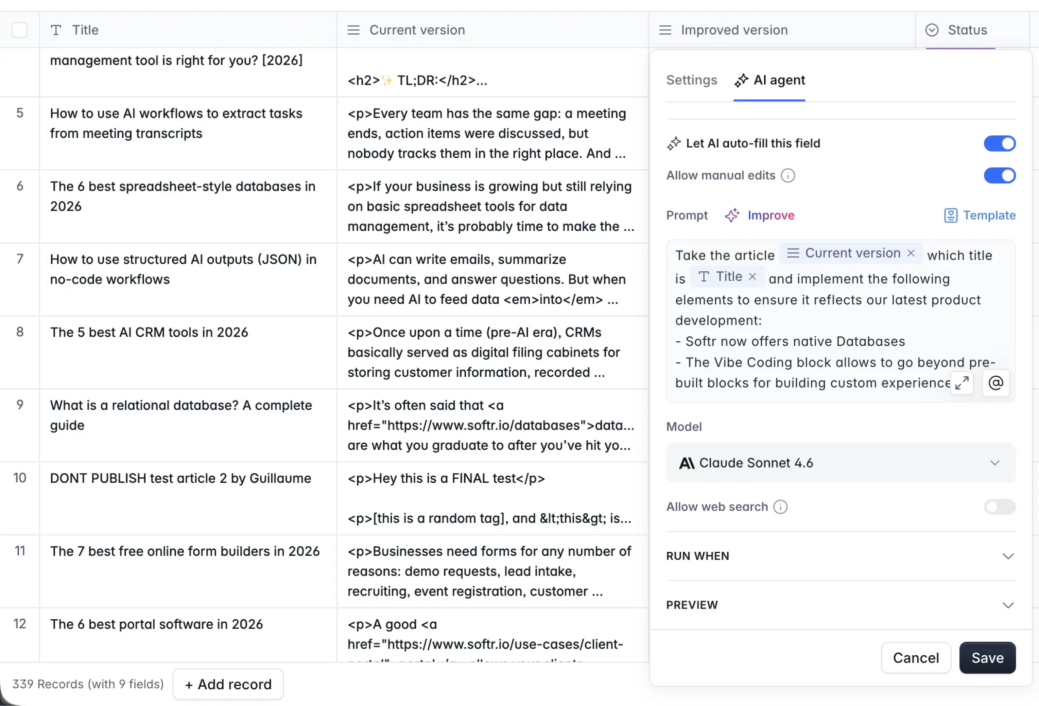 Instead of building a dedicated workflow, you can add a Database AI Agent step directly in your Softr Database. The AI Agent watches the Current Text field and automatically generates an improved version in the AI Suggested Text field based on your prompt. This approach is simpler to set up if you're processing content on the fly. Make sure the AI Suggested Text field is editable so reviewers can refine the output manually if needed.