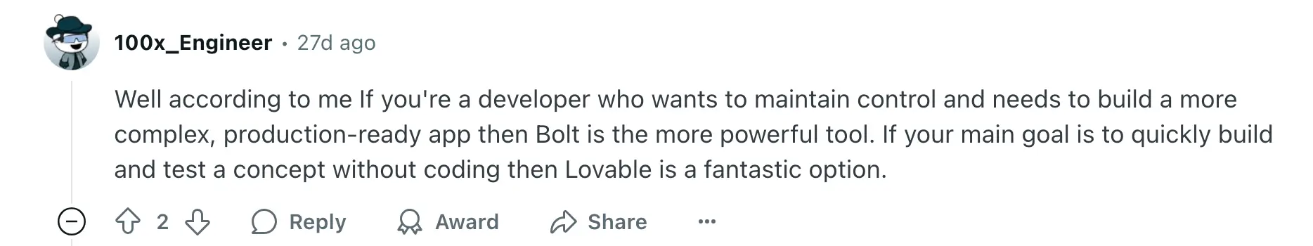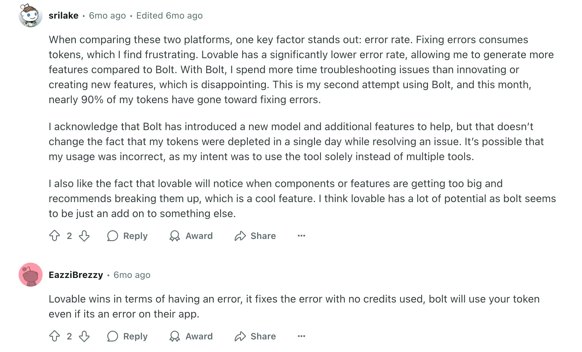 Conversations on Reddit highlight how developers and teams weigh the trade-offs between Lovable vs Bolt. One user highlights: