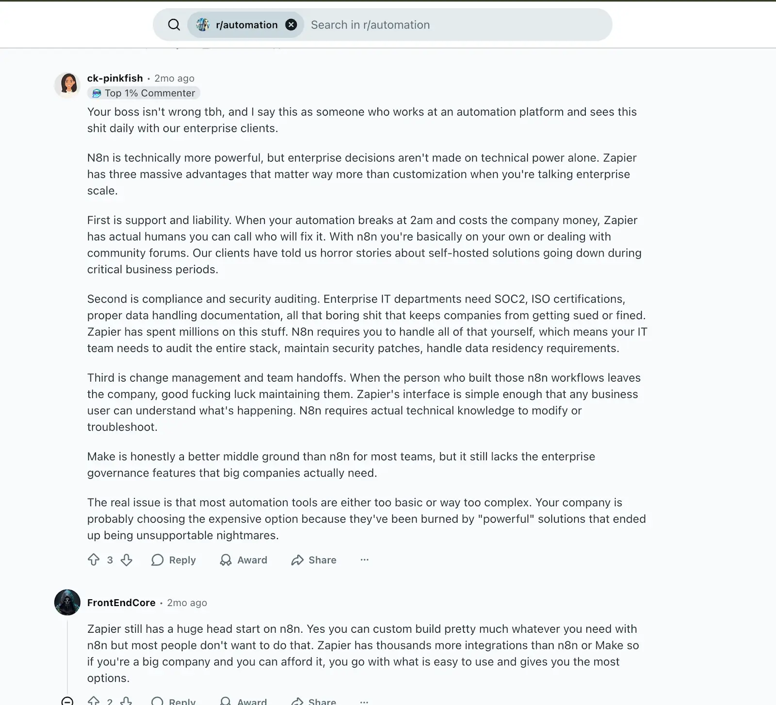 Other Redditors point out that while Zapier can cost more as you scale, the higher price includes things like support, compliance, and security auditing, and easier handovers when team members leave. For teams that don’t want to manage servers or fix self-hosted workflows themselves, that peace of mind is a major reason to choose Zapier, like this user: