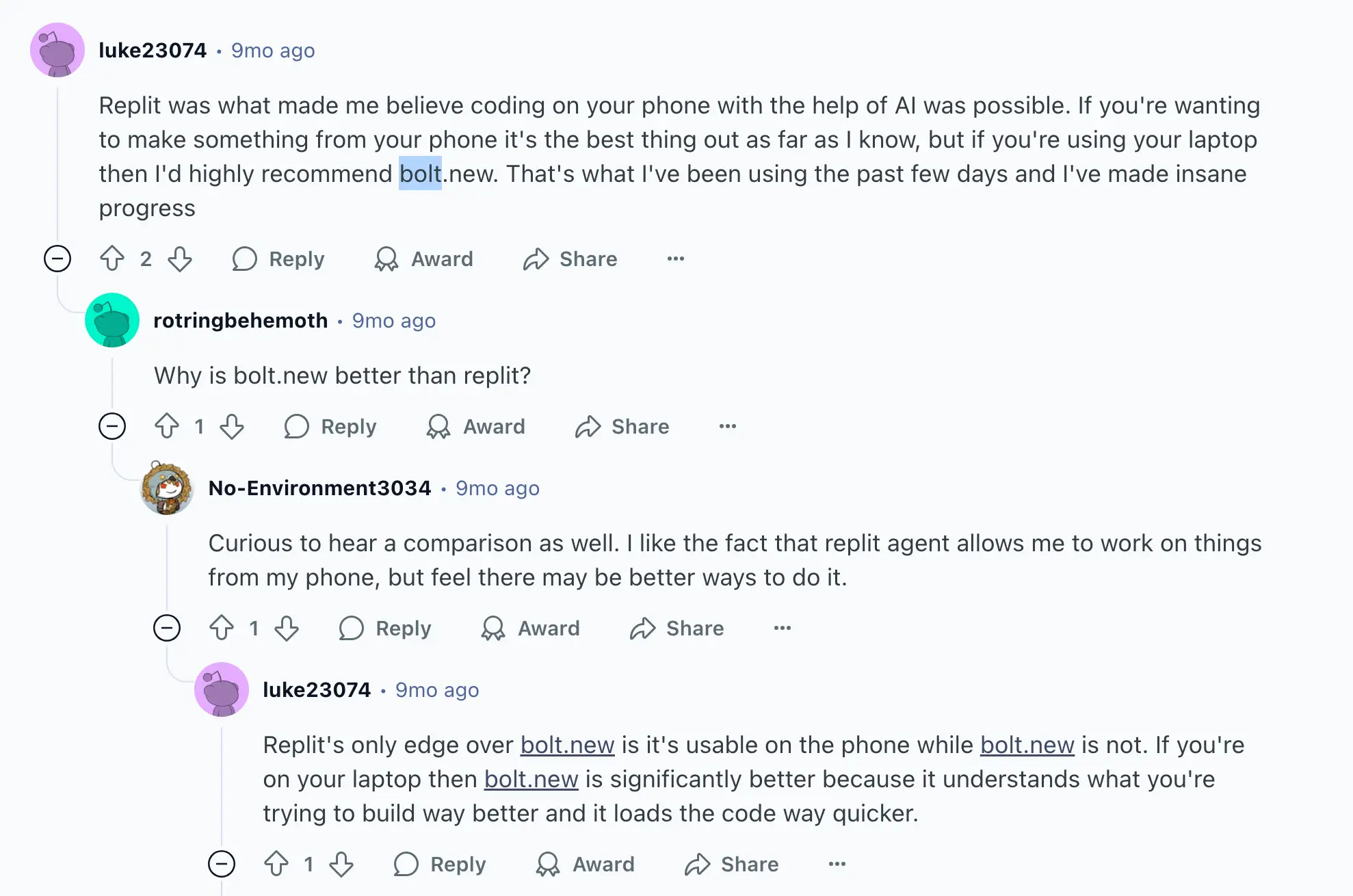 Others mentioned that Replit is stronger for backend work, while Bolt is great for quick front-end scaffolding. One even mentioned using both tools depending on the task.