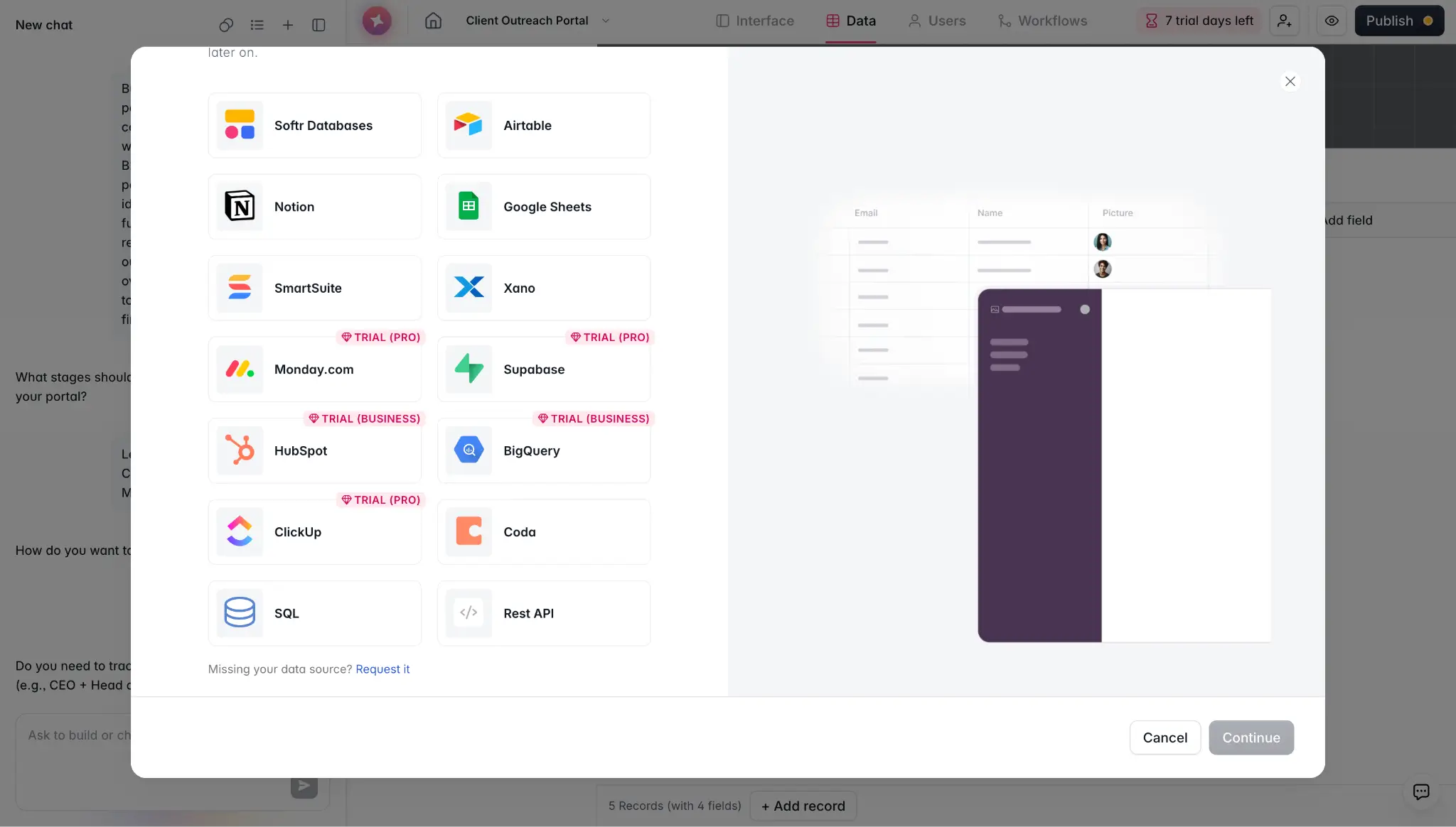- A native relational database and 17+ external data source integrations, so you can store data directly in Softr or connect to tools you already use.