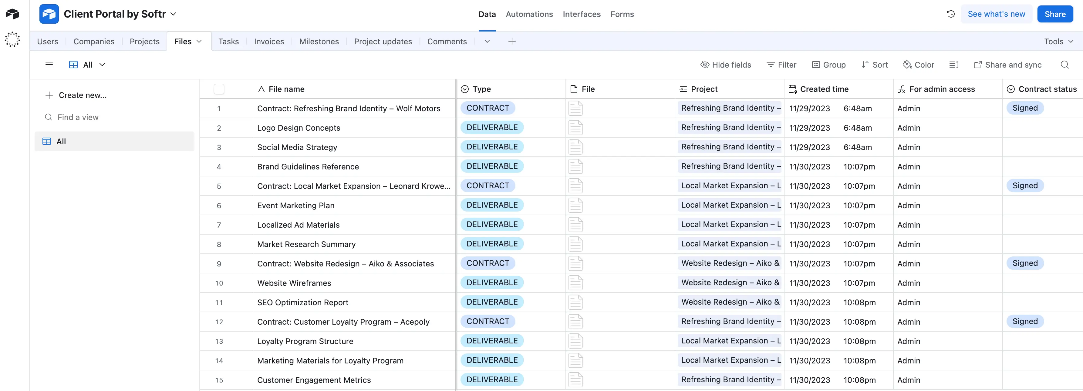 Softr is a no-code platform with its own native relational database. It’s ideal for small businesses that have outgrown spreadsheets and want a more scalable, all-in-one solution without hiring developers. You can use Softr Databases to organize your data in one place, or turn it into useful tools your employees or customers can interact with, such as a CRM, portal, or dashboard.