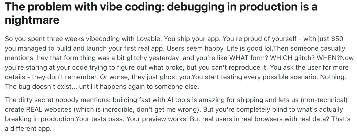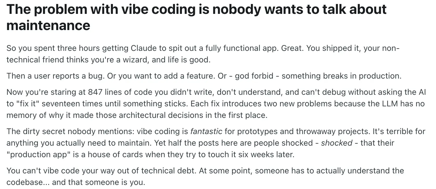 In one Reddit post, a builder talks about what happens after the initial excitement wears off: you ship something quickly, everything looks good, and then a bug shows up. Suddenly you’re staring at hundreds of lines of code you didn’t write, repeatedly asking the AI to “fix it,” only for each fix to introduce new issues. What started as momentum turns into trial and error.