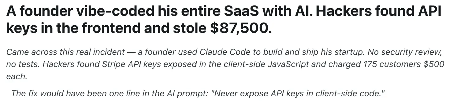 A founder built and shipped their SaaS using AI tools, only for attackers to find exposed Stripe API keys in the frontend and use them to charge customers directly: