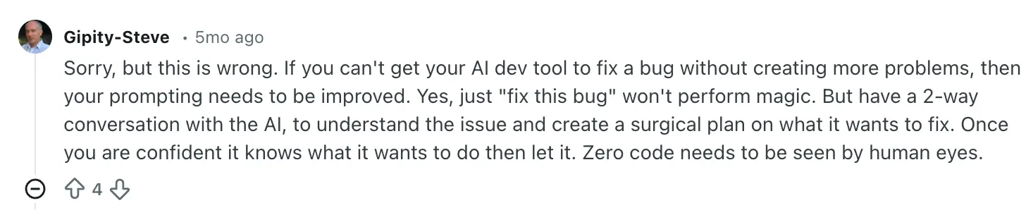 Even the advice from more experienced users reflects this shift. Instead of blindly prompting, they talk about needing to slow down, guide the AI more carefully, and treat it less like magic and more like a tool that still requires oversight and structure.