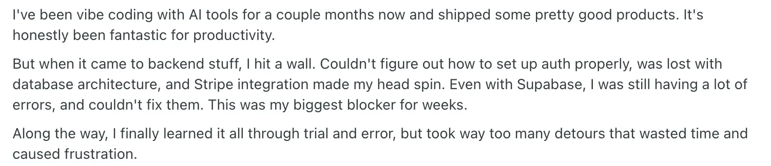 One builder described backend concerns — authentication, database structure, payments — becoming “the biggest blocker for weeks,” even after the app itself looked mostly done: