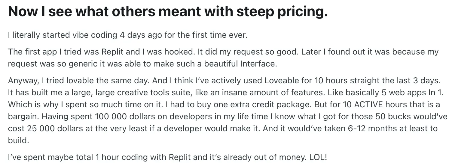 And it’s not just one platform. Builders using Lovable describe the same pattern: credits that sound reasonable upfront but disappear quickly once you start building real features. One user burned through €25 in credits just getting halfway through an MVP, noting that even simple fixes can cost multiple credits each time.