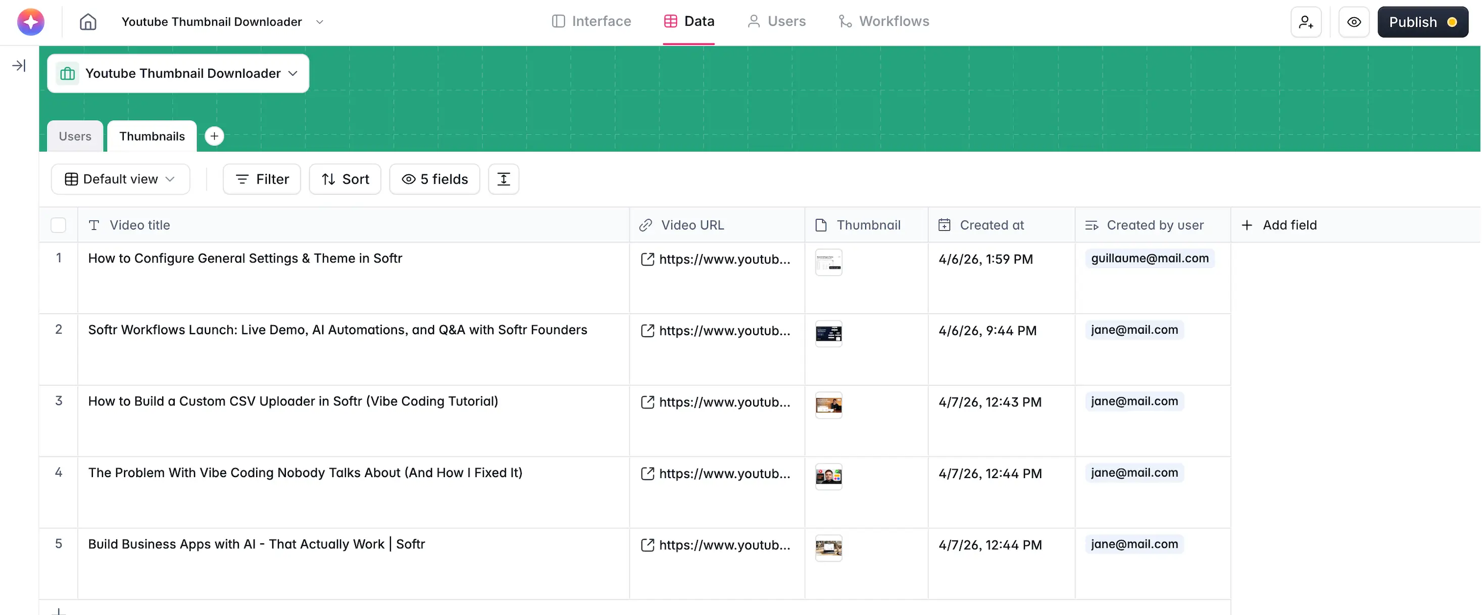 - Create a Softr Database to store your extracted thumbnails.