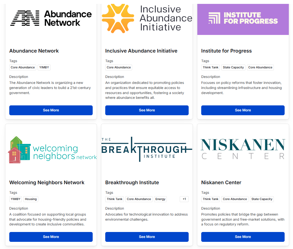 An interactive platform built with Softr and Airtable to catalog and showcase over 100 organizations, voices, resources, and job opportunities aligned with the abundance agenda.