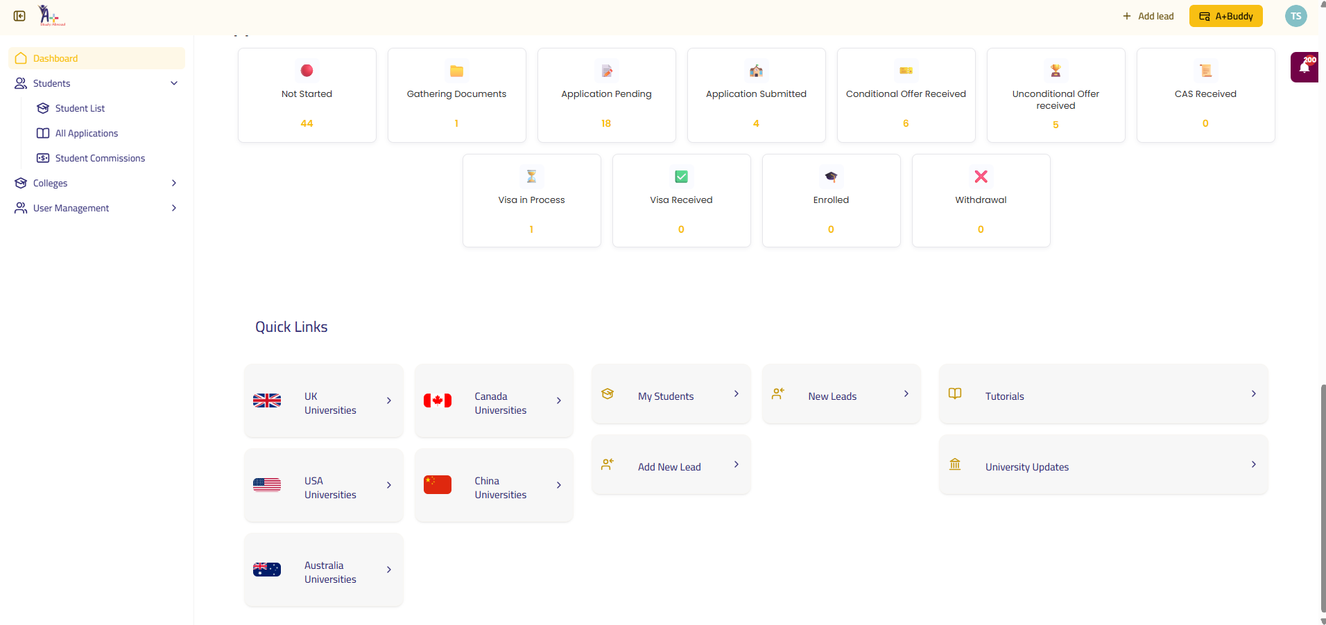 Students benefit from a personalized dashboard, real-time notifications, and WhatsApp integration for easy updates and document uploads. Counselors can access detailed student profiles, track progress, and use AI-driven tools for eligibility checks and program recommendations. For administrators, the system provides real-time dashboards, lead pipelines, and performance insights to optimize resource allocation and decision-making.