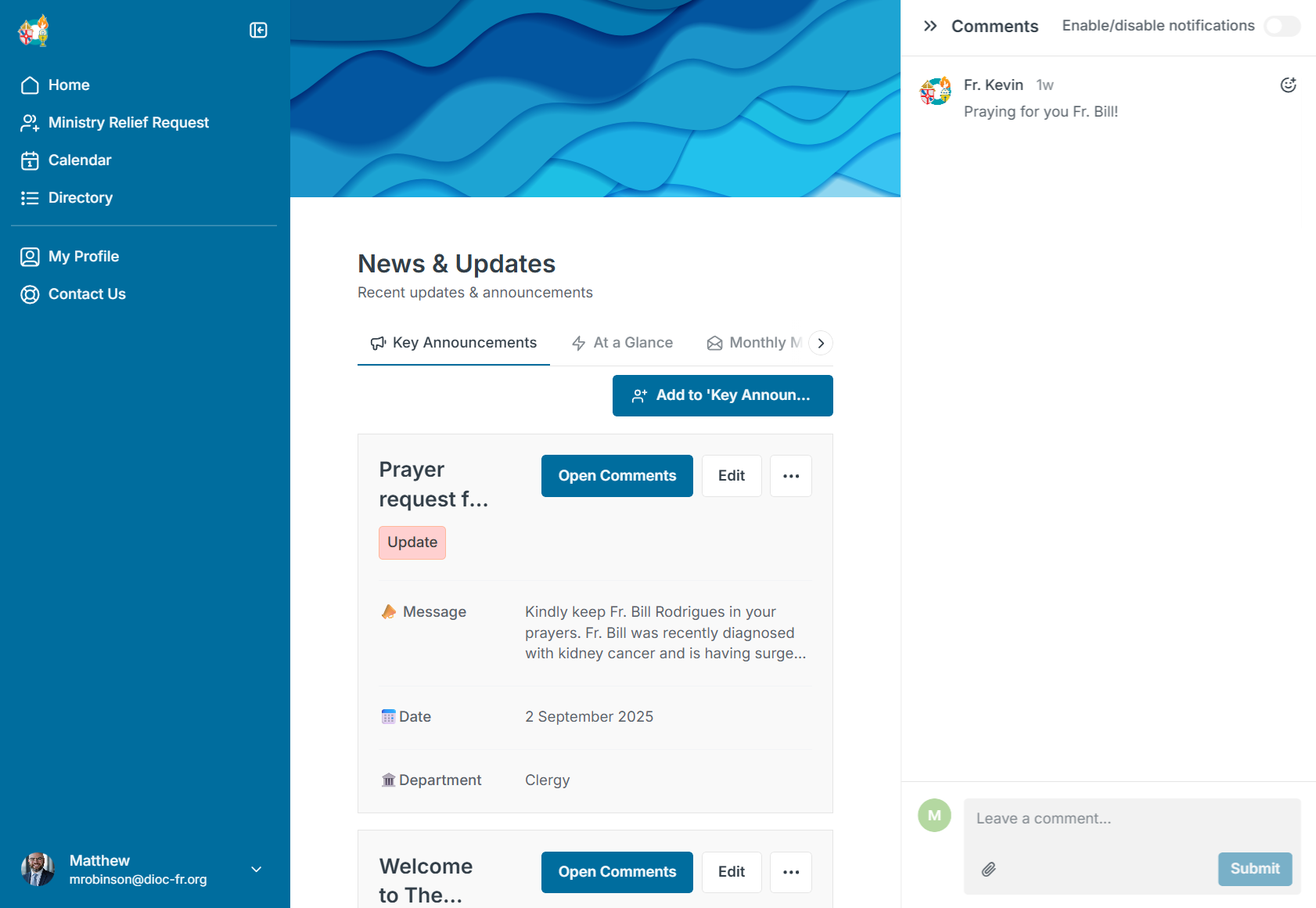 - Content Management: Admins can publish updates, announcements, and key diocesan communications.