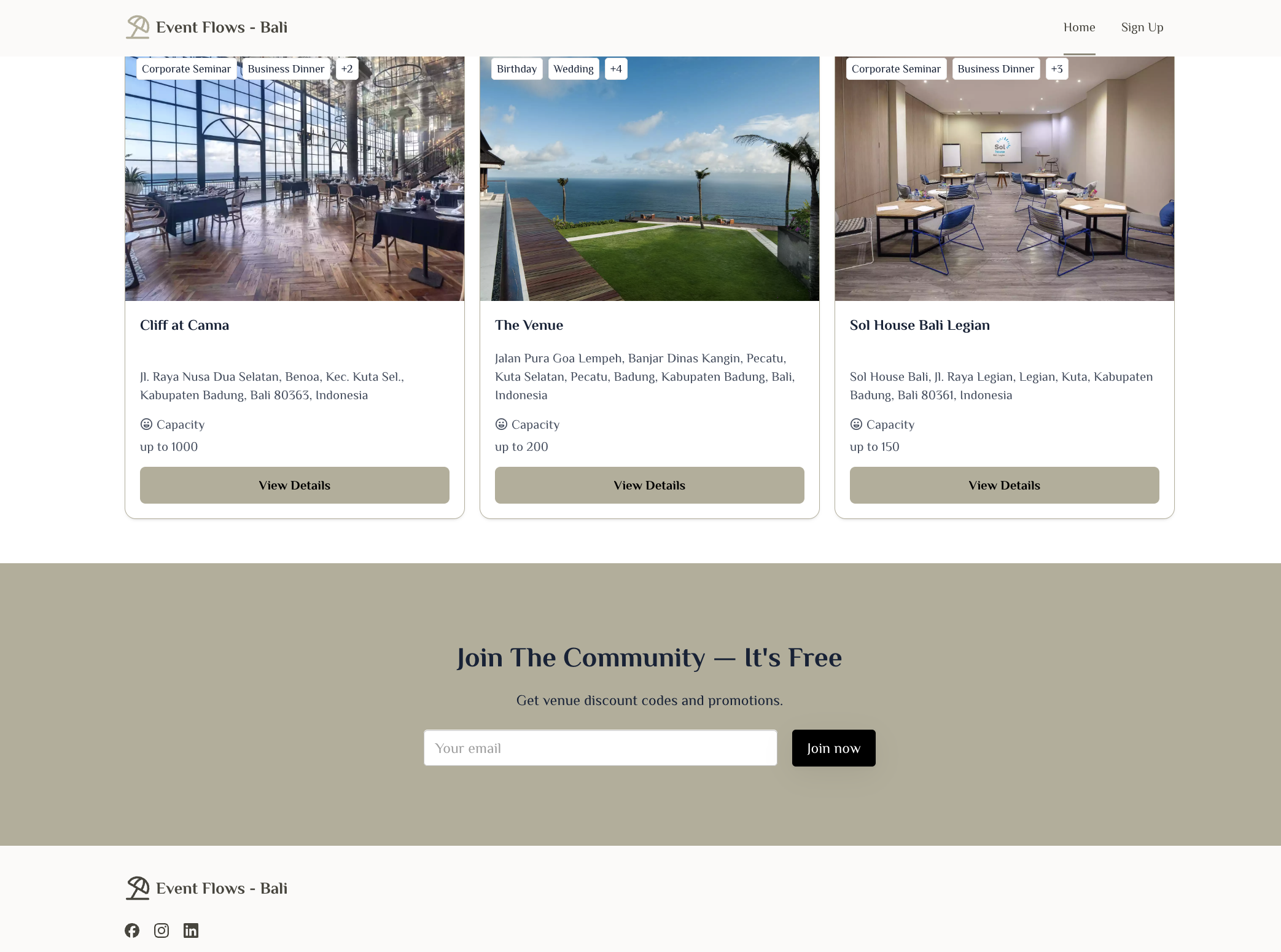 Event Flows is a portal created with Softr and Softr databases, aiming to allow venue owners or vendors to list their properties and customers to find a property within the portal. Customers looking for a venue for events such as a networking event, birthday, or wedding can use the portal to view all venues and vendors and inquire with a specific vendor. Hosts can also sign up on the portal to showcase their venue. The portal allows users to filter venues based on event category, accessibility, catering services, and amenities. Each venue has a detail page that displays information like the address, event categories, gallery images, host contact information (name, number, email), a description, seating capacity, amenities, catering information, cancellation policy, a map, and reviews/directions. The system also includes a database with two tables: one listing all venues and their information, where the admin can approve applications by changing the status, and another for inquiries connected to the forms filled out by customers.