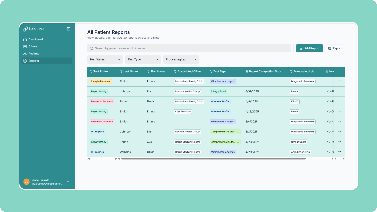 A custom portal to manage patient test reports and streamline lab operations across multiple clinics.