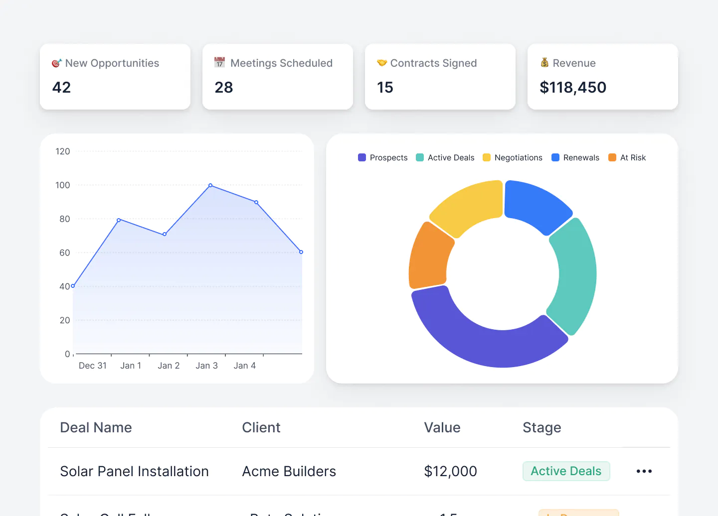 Track leads, deals, and accounts with custom views, filters, and status tracking connected to your live data.