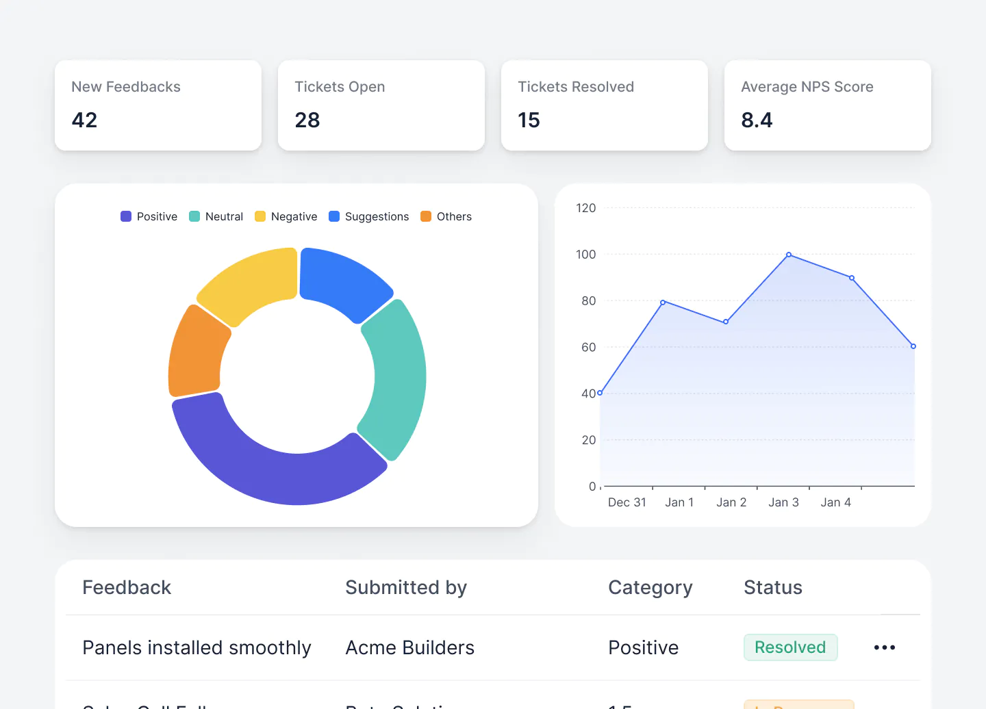 Monitor tickets, feedback, and performance using live ticketing systems and dashboards built around your workflows and team roles.