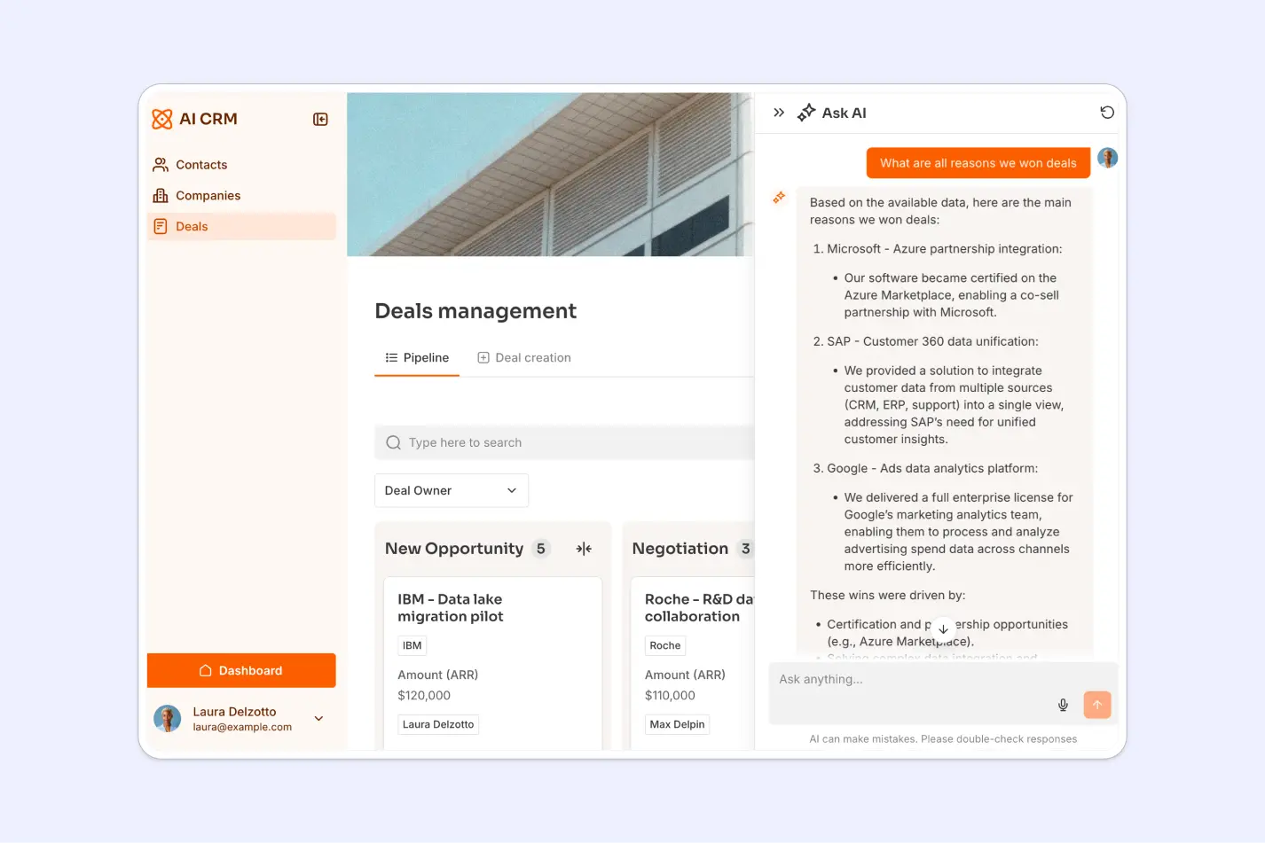 - Chat with your deal data: The "Ask AI" feature allows your team to have natural conversations with account histories and interaction logs to get instant answers without digging through complex deal files.