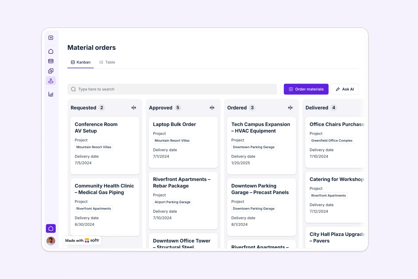 AI automatically categorizes material requests and provides Project Managers with chat interfaces to access insights about tasks, orders, and projects—streamlining decision-making.