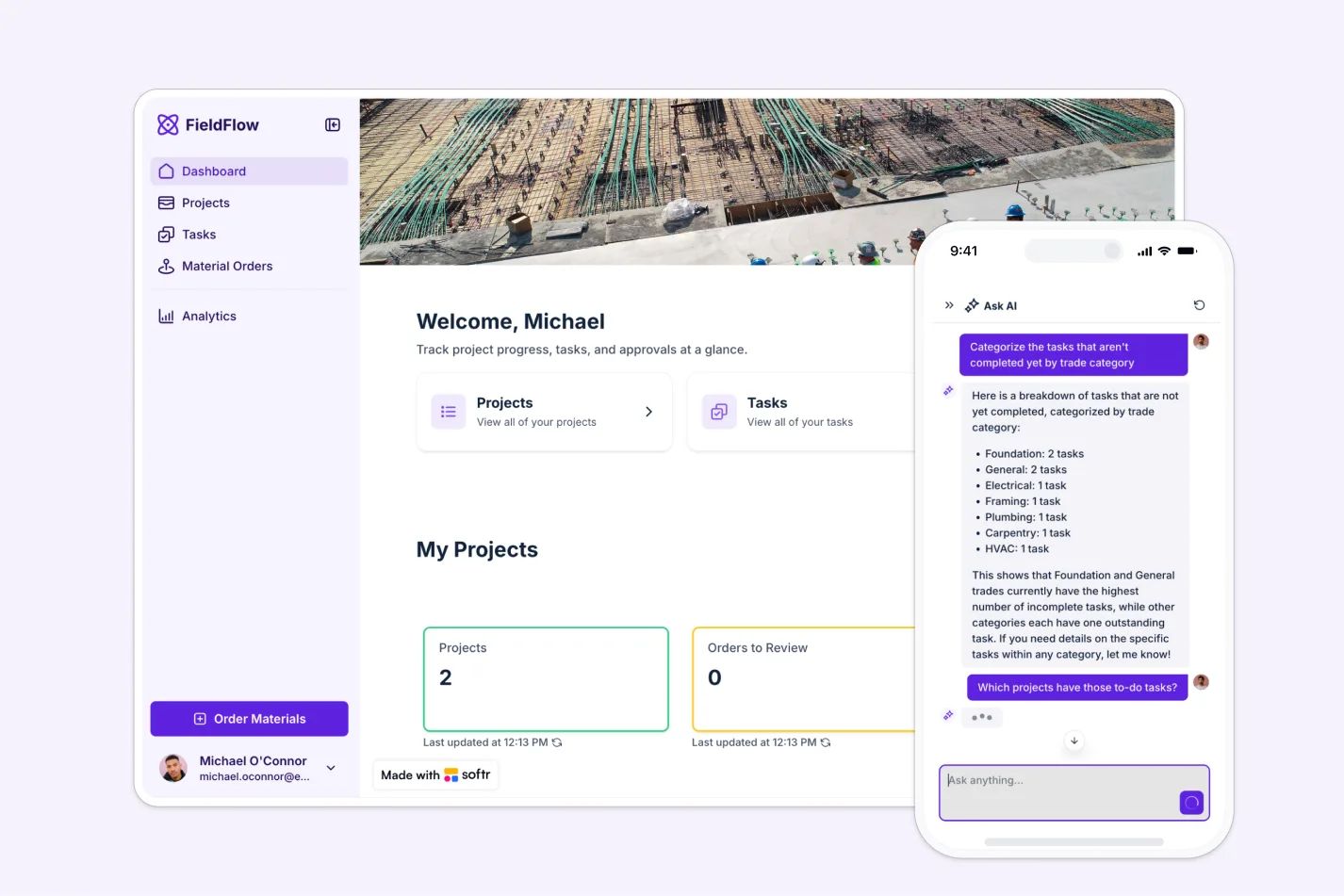 - Centralize project operations in one place: Manage tasks, materials, documents, and inspections in a single platform accessible from any device.
