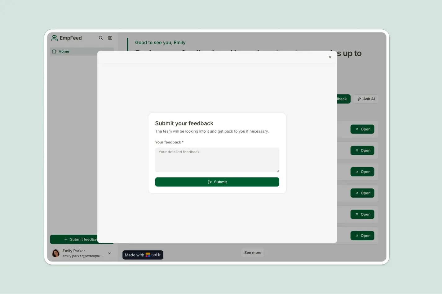 Let employees submit feedback quickly through a minimal form designed to reduce friction and encourage participation.