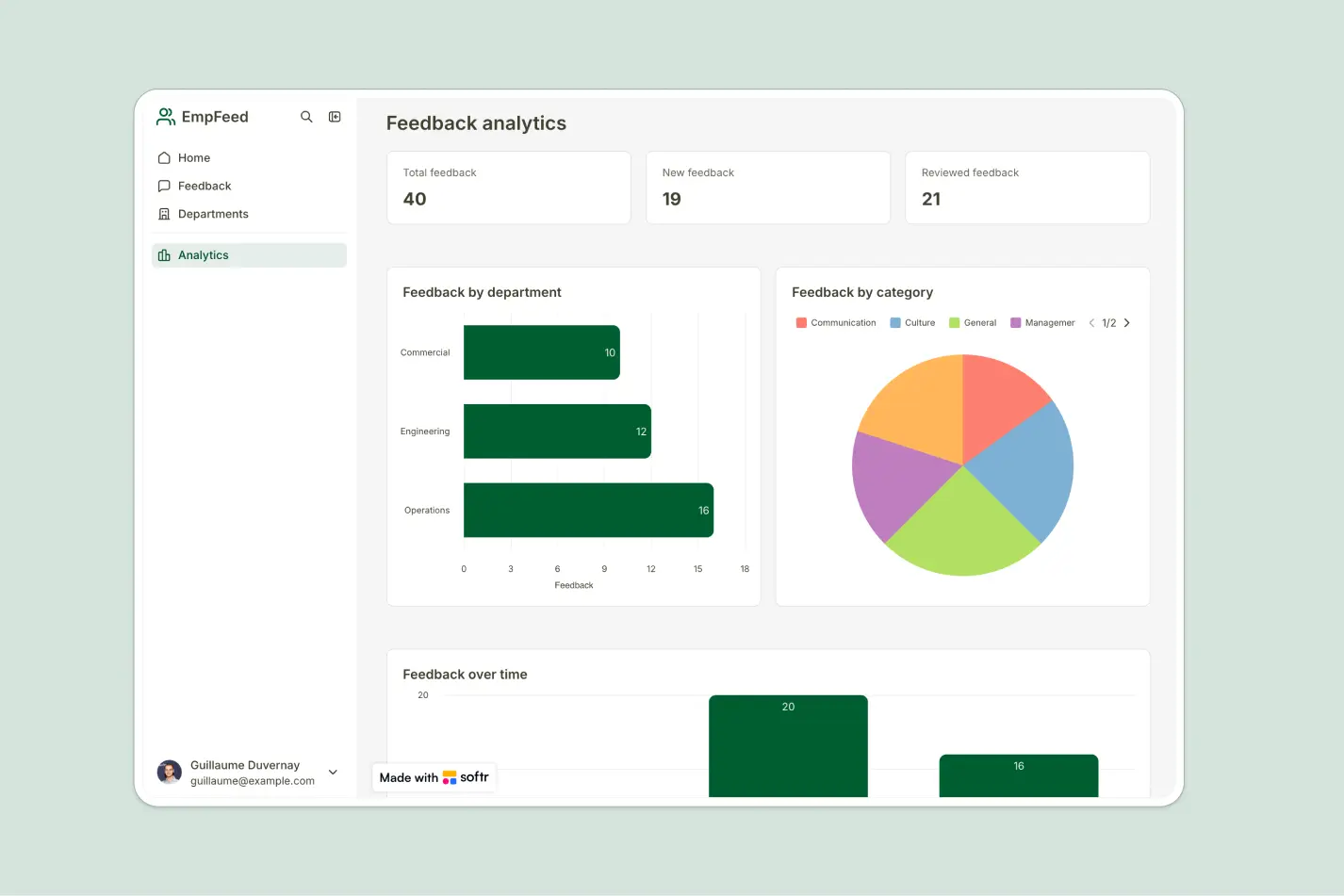 - Keep feedback organized and actionable: Group entries by department, assign categories and tags, and review team-level trends in one place.