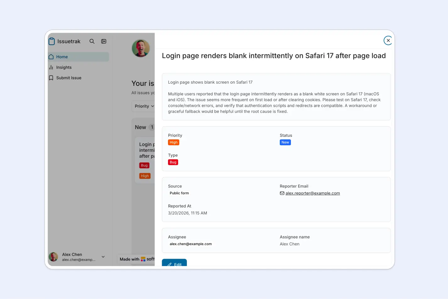 Capture new issues with title, description, type, priority, due date, reporter email, and attachments.
